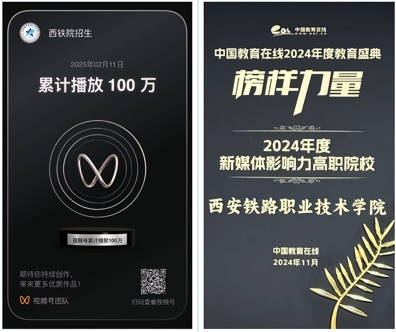 左:微信视频号播放量证书 右:新媒体影响力高职院校奖牌