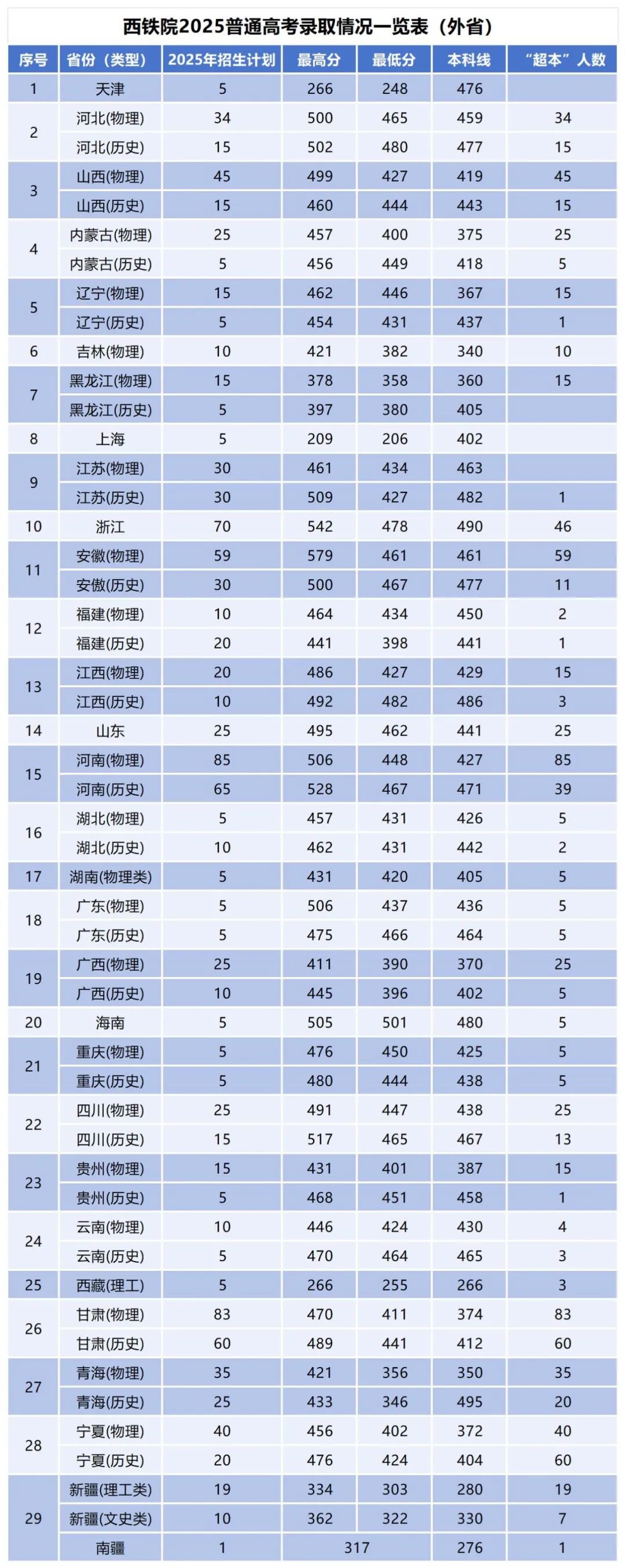 省外招生成为一大亮点,西安铁路职业技术学院在全国29个省(区、市)实现一次满额投档,除天津市、上海市高职(专科)批次只计语、数、外成绩外,其余27个省份均有超过本地本科线的考生选择西铁院。其中河北、山西、重庆、内蒙古、辽宁等12个省(区、市)实现物理类、历史类最低录取分“双超”本科线;河南、安徽、湖北、广西、四川、贵州、青海、新疆等8个省(区、市)物理类录取分也高于本科线。统计显示,省外录取中超过二本线的新生达939人,占比高达84%,较去年增幅显著。