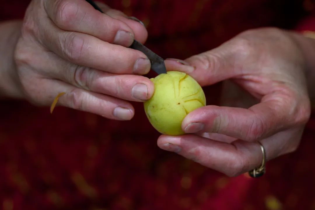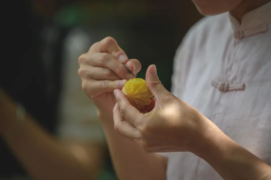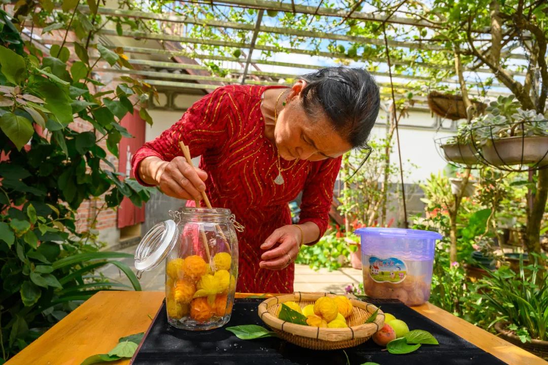 有幸拜访了当地一位雕梅手艺人,跟着阿嬢体验雕梅制作,看着她取一颗饱满的青梅,手指轻转,小刀游走间,各种花纹便在果肉上悄然绽放,汁水渗出时,竟真有几分“绣花”的紧张感。