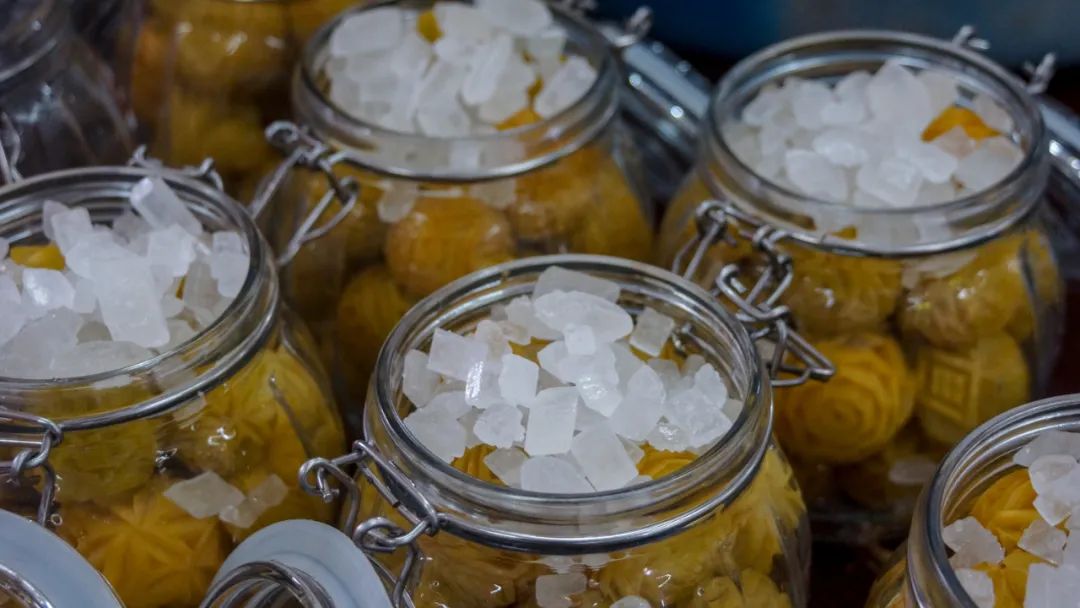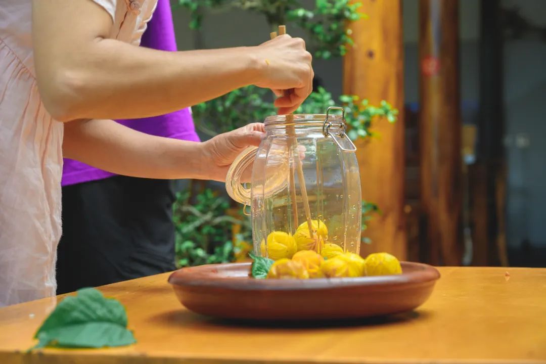 阿嬢告诉我,雕刻好的梅子需在淡盐水中浸泡整夜,褪去青涩,再控干水分,放上冰糖,灌满当地自家烤制的米酒浸泡一年以上风味最佳。