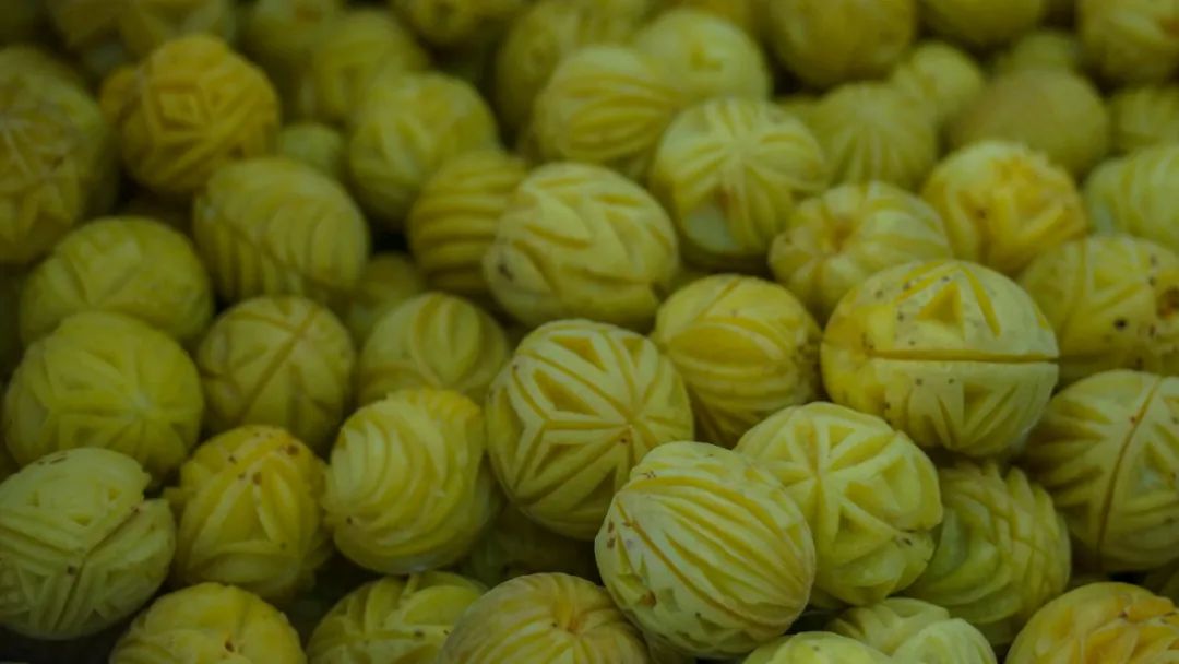 与腾冲雕梅的初见,始于一场活动的非遗展览。这是一种在青梅上雕刻花纹的传统美食,也是云南省的一种非物质文化遗产。