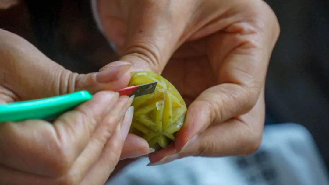 腾冲人用特制小刀在青梅上旋出60余种花纹:玉兰、菊瓣、藤蔓……其数量之多、成品之精美,在全国都绝无仅有。