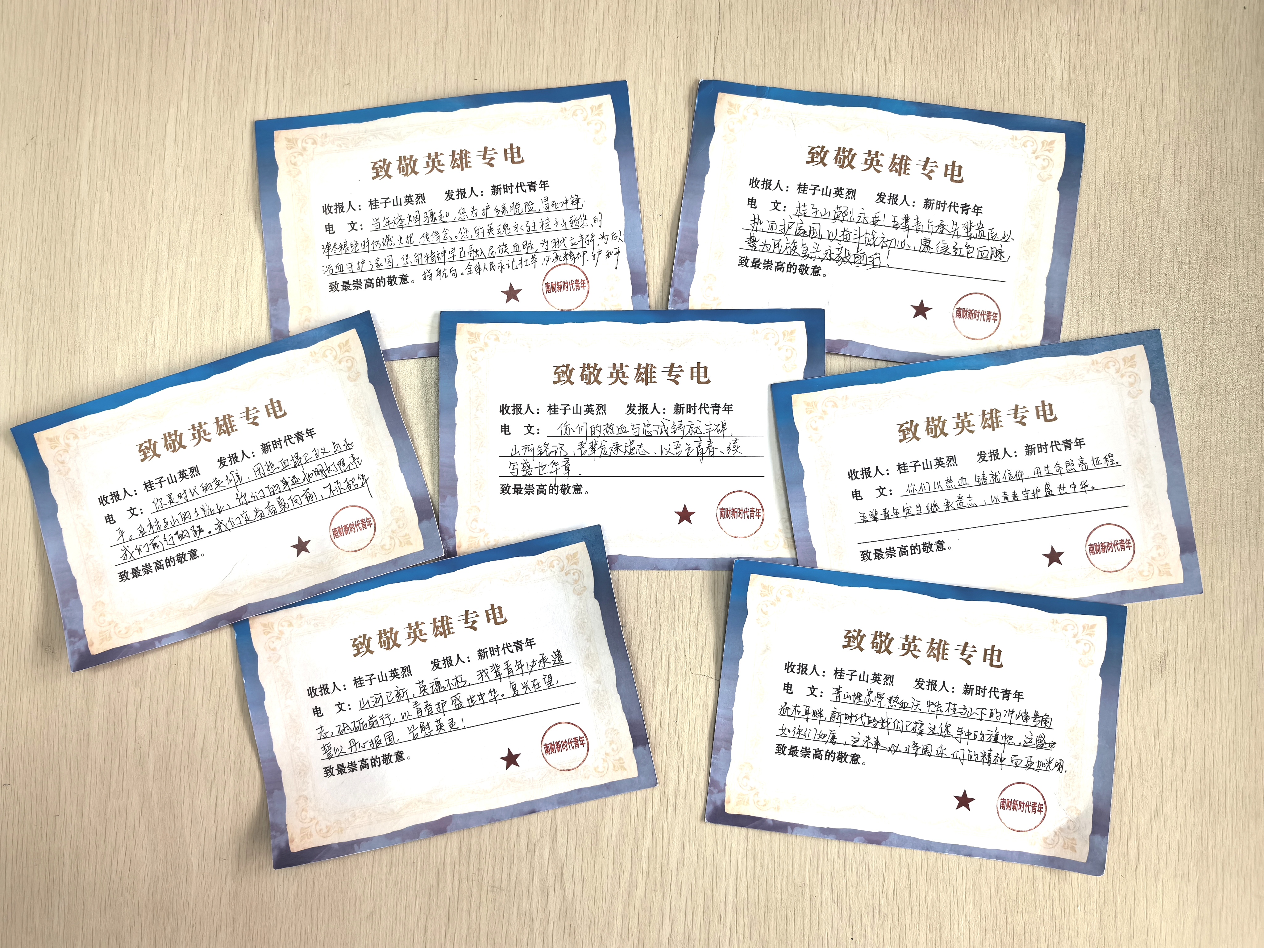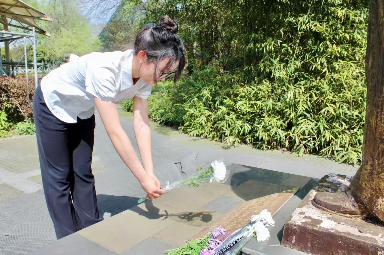 “如此近距离了解这座纪念碑,让我读懂了江桥抗战作为抗日第一枪的意义,民族危亡时刻,先辈们用血肉筑起了新的长城。”站在齐齐哈尔和平广场江桥抗战纪念碑前,南财大经济学院数经2401班孔艺璇第一次把自己的家乡和世界反法西斯战争直接联系在一起。在上海四行仓库抗战纪念馆,同学们屏息聆听“八百壮士”浴血坚守的壮举,斑驳的弹痕墙与附近林立的高楼大厦,形成今昔的强烈对比。在南京抗日航空烈士纪念馆,学生们肃立默哀,向抗战中牺牲的中国空军飞行员敬献鲜花,指尖轻触花瓣的瞬间,仿佛与先烈的忠魂完成一场跨越时空的对话。“八十年前,年轻的他们只留下了姓名,八十年后的我们,同样年轻,也应该在新时代征程上留下青春奋发的印记。”南财大工商管理学院人资2201班嵇梦月被烈士们英勇抗战的精神深深感染。