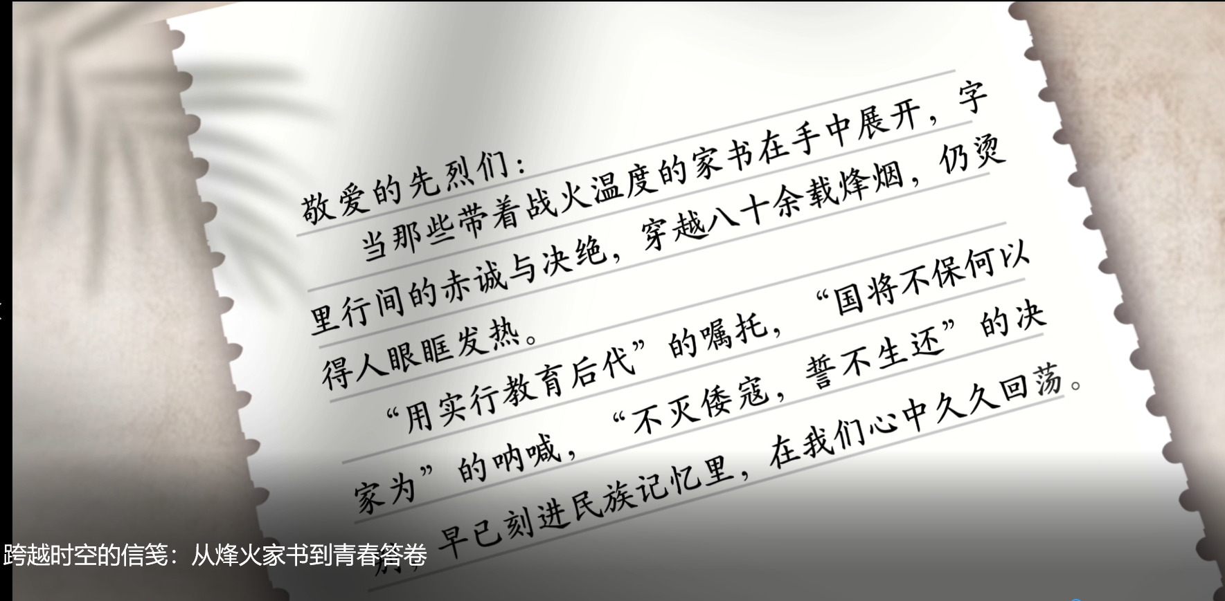 “敬爱的先烈们:当那些带着战火温度的家书在手中展开,字里行间的赤诚与决绝,穿越八十余载烽烟,仍烫得人眼眶发热。”《跨越时空的信笺:从烽火家书到青春答卷》以“信笺”为精神纽带,从青年学子的视角切入,构建起跨越80年的时空对话,展现新时代青年以奋斗为墨,对先烈嘱托作出的“青春答卷”。
