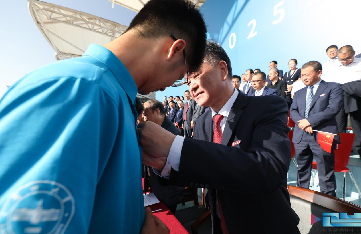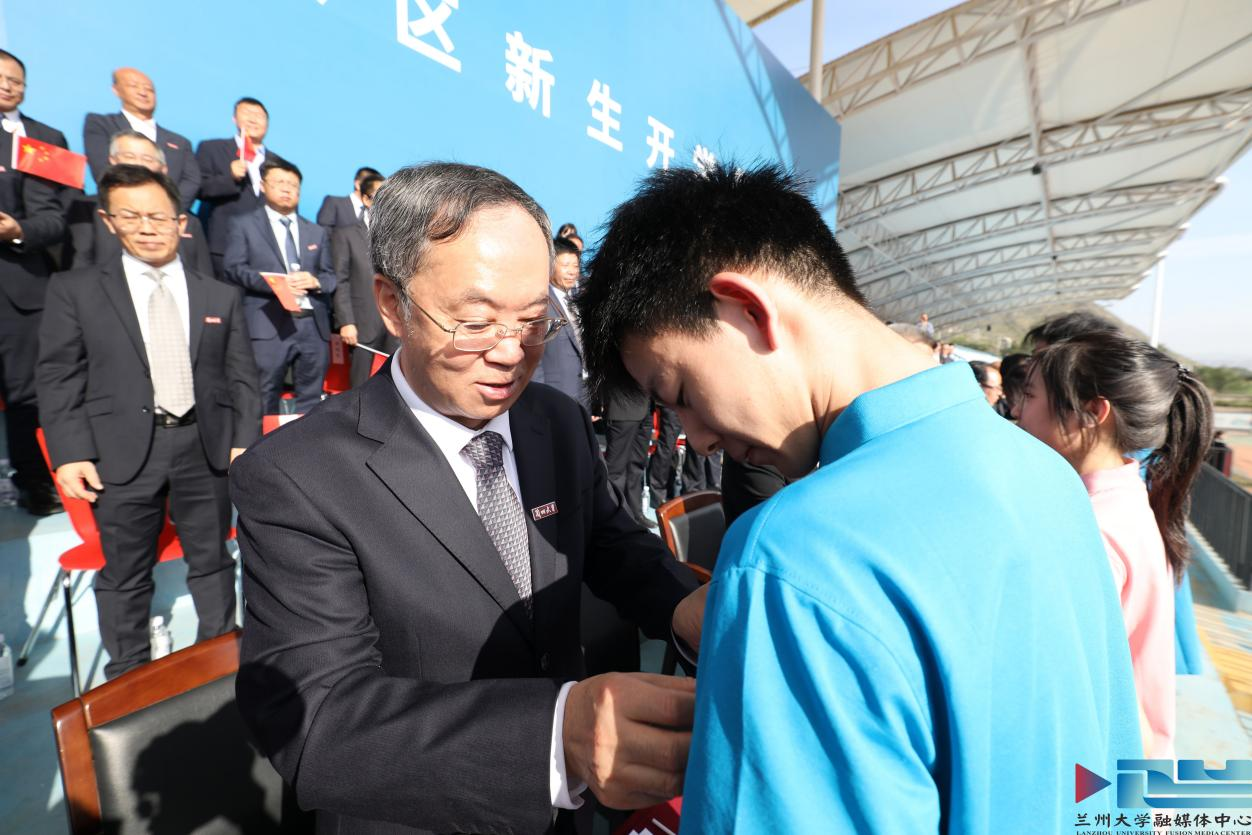 校领导为2025级新生代表佩戴校徽,其他同学也将校徽佩戴在胸前。小小的徽章,印刻着兰大的精神内核,是“自强不息,独树一帜”校训的具象承载,鼓励每一位新兰大人以校为荣,不负韶华,在这片沃土上书写属于自己的青春华章!