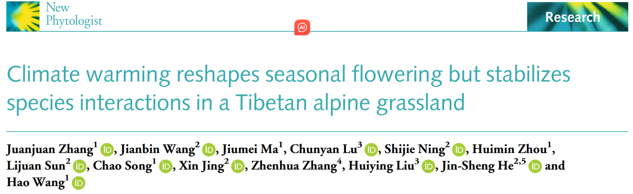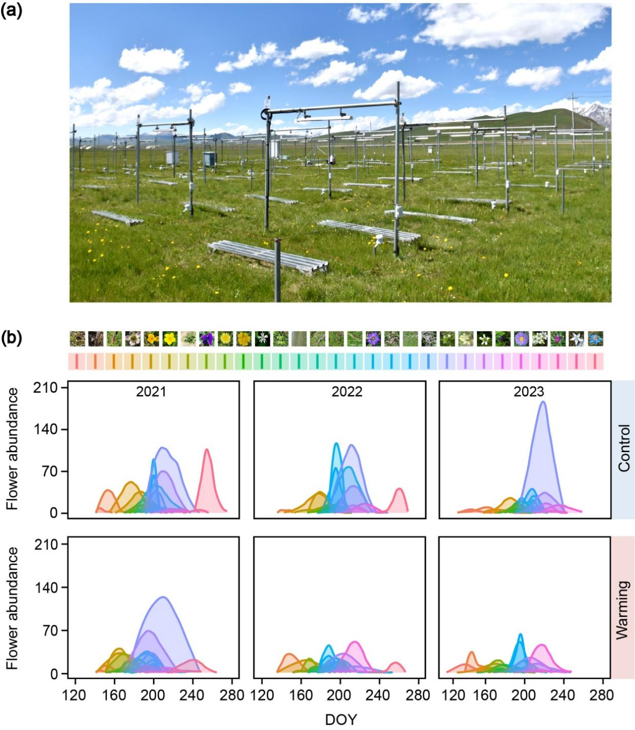 基于此,兰州大学生态学院科研团队等依托青海海北定位站高寒草甸增温控制实验平台,于2021–2023年对29个植物物种的开花季节动态进行了连续监测(图1),并利用物种间开花时间的重叠度评估了增温对两两物种(即“物种对”)潜在交互作用的影响。研究成果以“Climate warming reshapes seasonal flowering but stabilizes species interactions in a Tibetan alpine grassland”为题,于2025年9月2日正式在线发表在国际知名期刊New Phytologist。