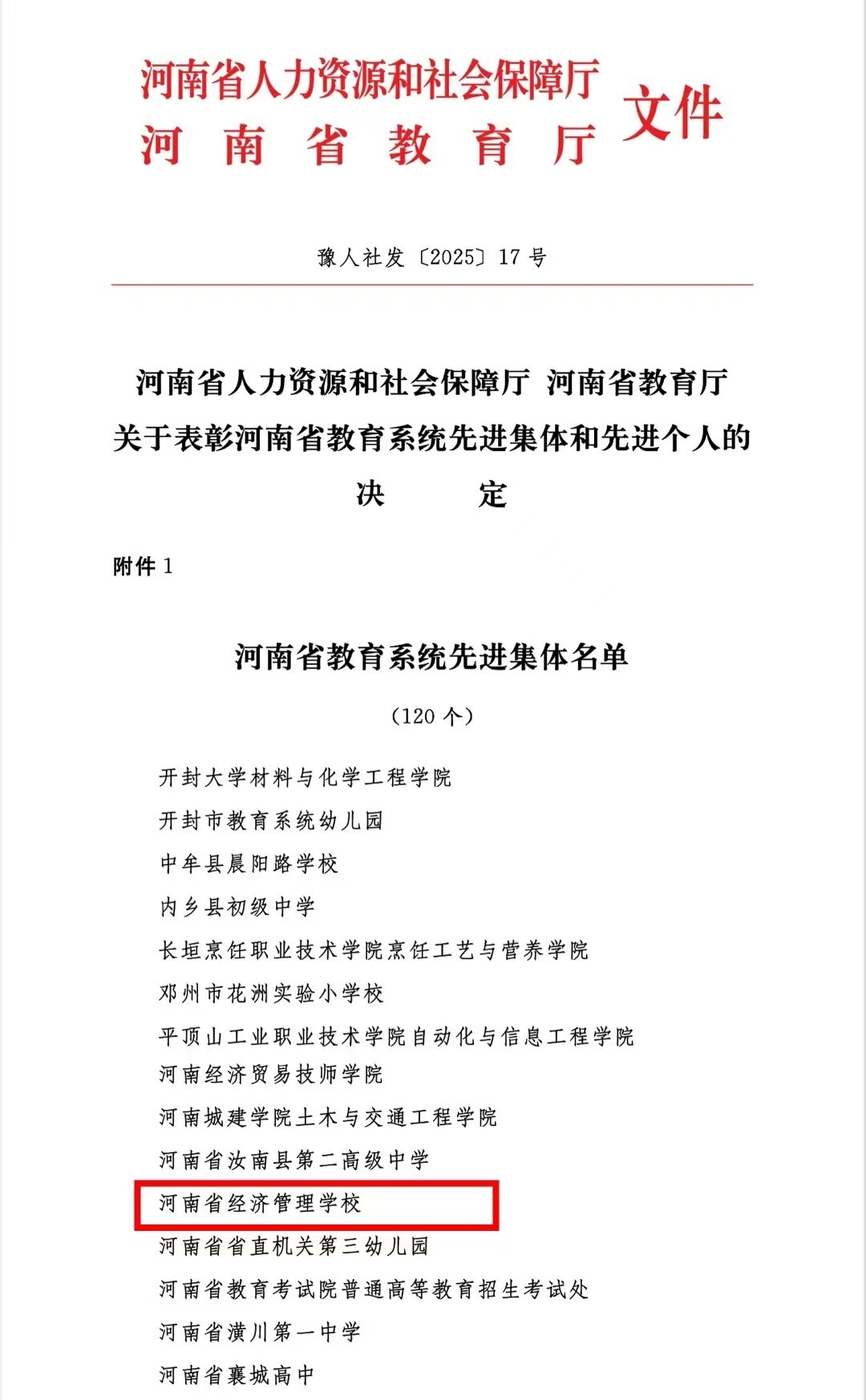 近日,河南省人力资源和社会保障厅、河南省教育厅联合发布《关于评选表彰全省教育系统先进集体和先进个人的公示》。我校荣膺“全省教育系统先进集体”称号,教师王明丽获评“全省教育系统师德先进个人”。这份沉甸甸的荣誉,是省政府、省教育厅对学校办学成果的充分肯定,是全体师生员工共同努力的结晶。喜讯传来,我校全体师生倍感荣幸,深受鼓舞。