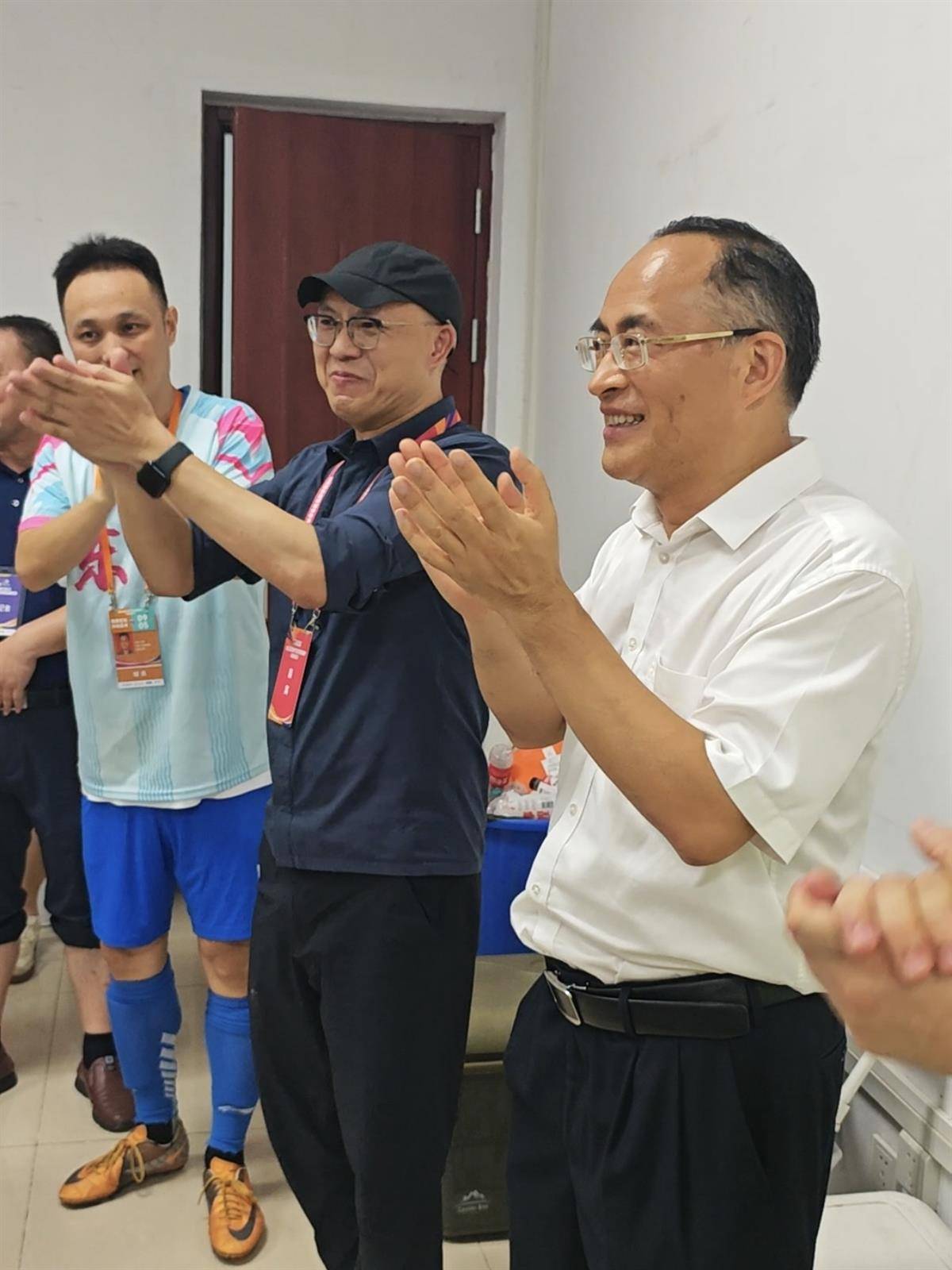 东湖风景区党工委委员、管委会副主任徐铁柱(右1)和 东湖风景区文化旅游体育局局长黄晓军(右2)慰问球员
