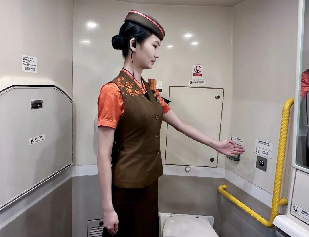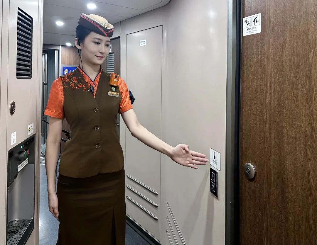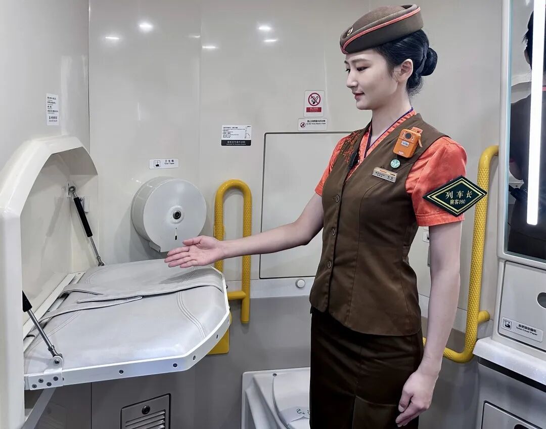 列车中的无障碍卫生间门采用电控开关设计,在卫生间门的一侧设有开关按钮,使用时切勿强行开门。卫生间内还配备了婴儿护理台,供有需要的旅客使用。