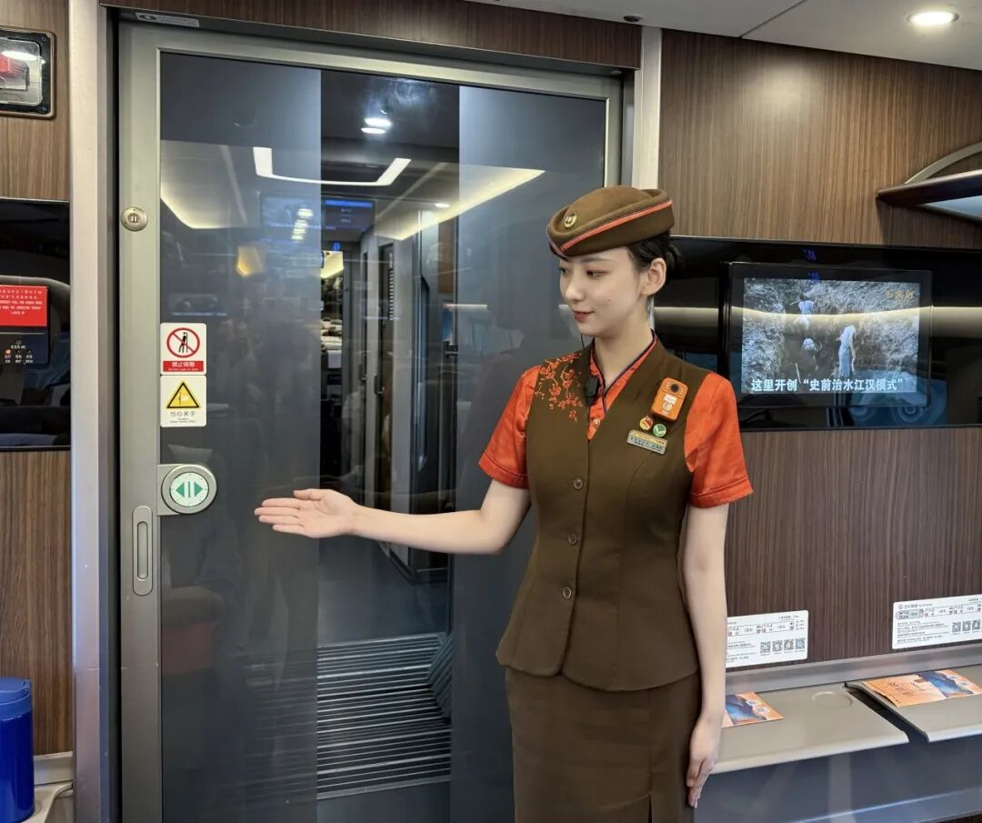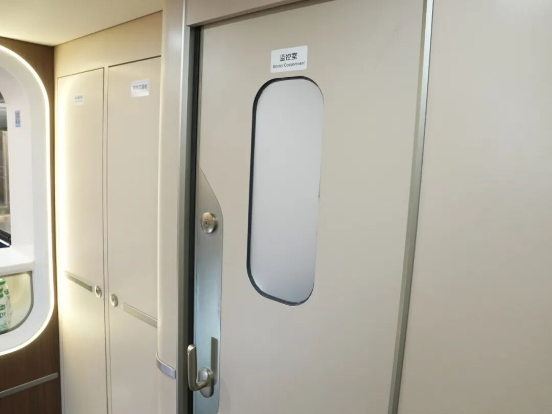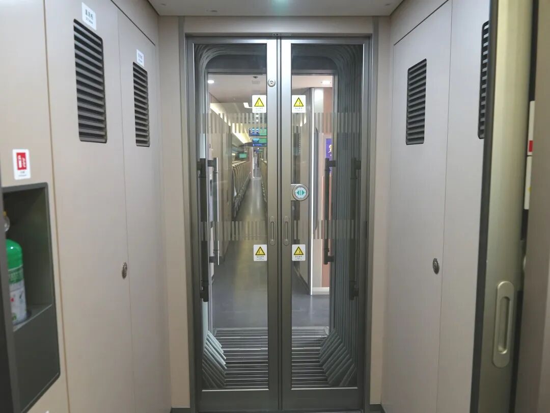 在每两节车厢之间,均设有一道防火隔断门。平时,这扇门隐藏在车厢门板中,不太容易被注意到,但当列车发生火情等紧急情况时,它就会发挥作用。工作人员会手动关闭防火隔断门,将相关区域与其他车厢隔离开,从而最大程度保障列车和旅客的安全。