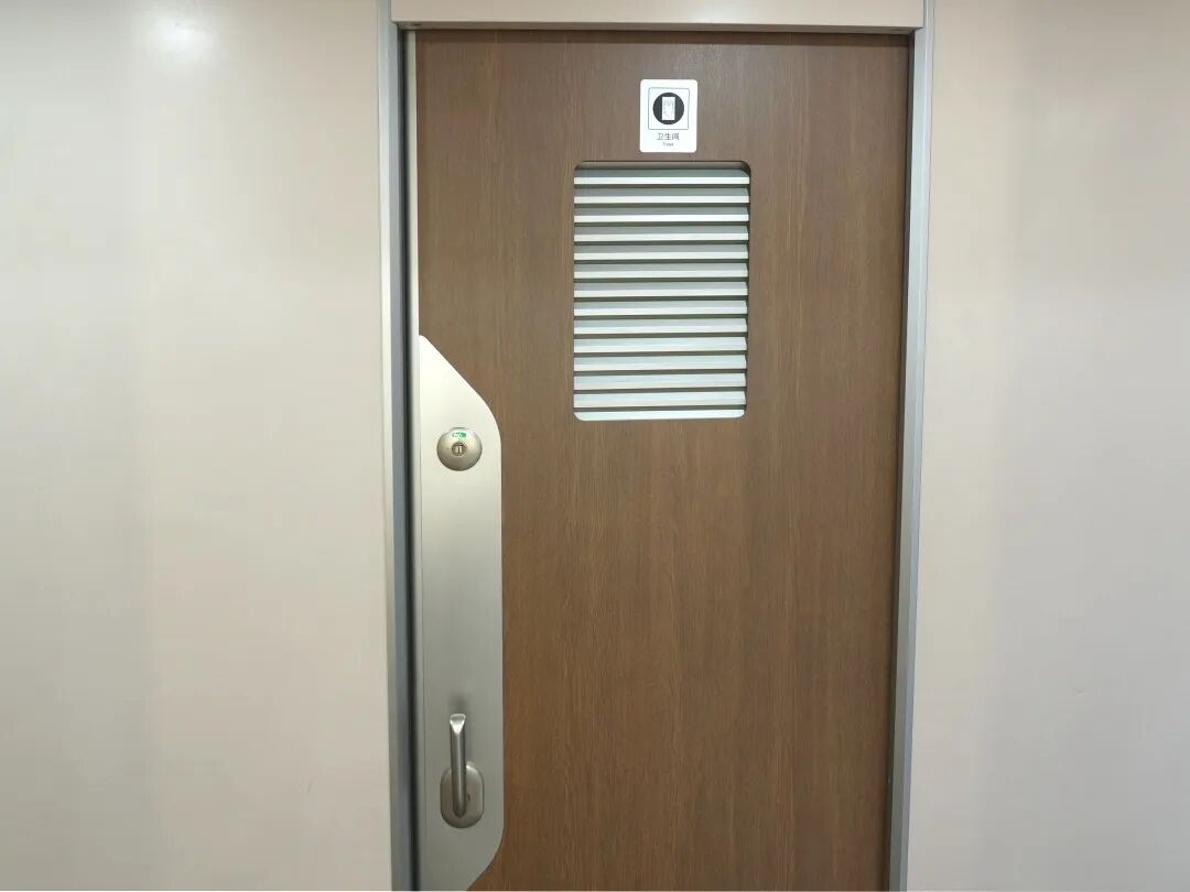 列车上的卫生间门设计也有讲究。普通卫生间门一般为手动推拉式,在使用时需先观察门把手上的指示区,当显示绿色“无人”状态时,轻轻推拉门把手即可开门。