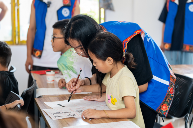 面对文山壮族苗族自治州的留守儿童,实践团带则来了一系列的艺术疗愈课程和乡村美育活动。在西畴县的5个村寨中,同学们通过绘画、音乐、舞蹈等艺术形式,为223名儿童搭建了情感表达的桥梁。8岁的小花在课堂上说:“我想把爸爸画成粉色老虎”,这句充满童真的话语背后,是艺术疗愈带来的情感释放。超过120名孩子在创作过程中绽放笑容,32名孩子主动向队员们倾诉心声,艺术的力量在这些孩子心中播下了温暖的种子。“他们来的这几天,我们村上的娃娃们可高兴坏了。”大寨村书记陈正丽不住的口的赞扬着这批来自杭州的青年学子。