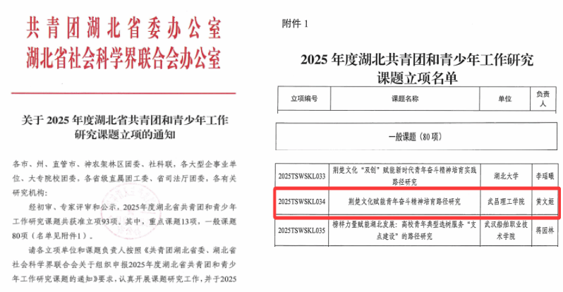 近日,共青团湖北省委办公室与湖北省社会科学界联合会办公室联合发布了《关于2025年度湖北省共青团和青少年工作研究课题立项的通知》。武昌理工学院马克思主义学院特色课部主任黄文姬副教授主持申报的《荆楚文化赋能青年奋斗精神培育路径研究》成功获批一般课题立项。