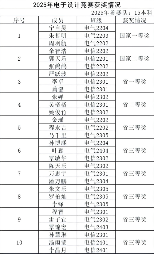近日,2025年全国大学生电子设计竞赛获奖名单正式公布。武昌理工学院人工智能学院代表队表现优异,共获国家级和省级奖项10项,包括国家级一等奖1项、二等奖1项,省级一等奖1项、二等奖1项、三等奖6项,获奖数量与质量均位居湖北省同类高校前列,并成为省内唯一连续三届蝉联国家级奖项的同类高校。