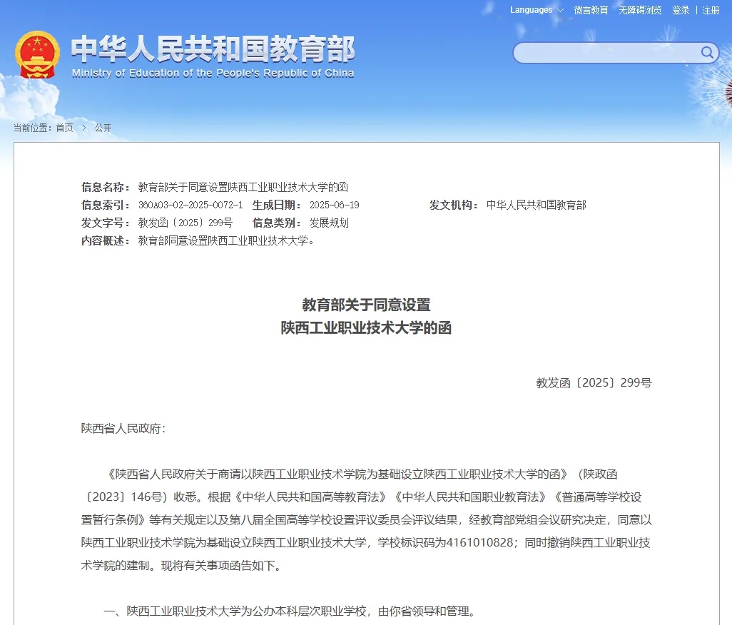2025年6月,教育部正式复函陕西省,同意以陕西工业职业技术学院为基础设立陕西工业职业技术大学,学校全日制在校生规模暂定为2万人。首批设置机械设计制造及自动化、材料成型及控制工程、自动化技术与应用、计算机应用工程、应用化工技术、建筑工程等6个职业本科专业。