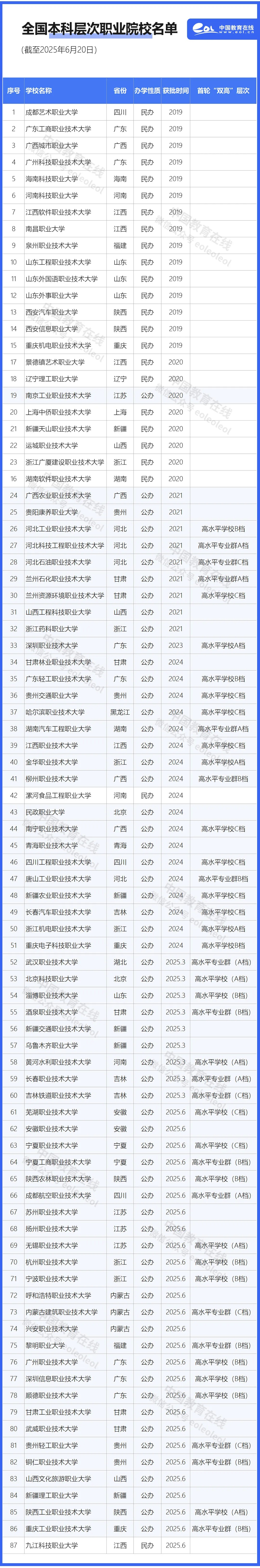 根据教育部发布的数据,截至2025年6月,我国累计已有87所职业本科院校,仅2025年就批复设立36所。