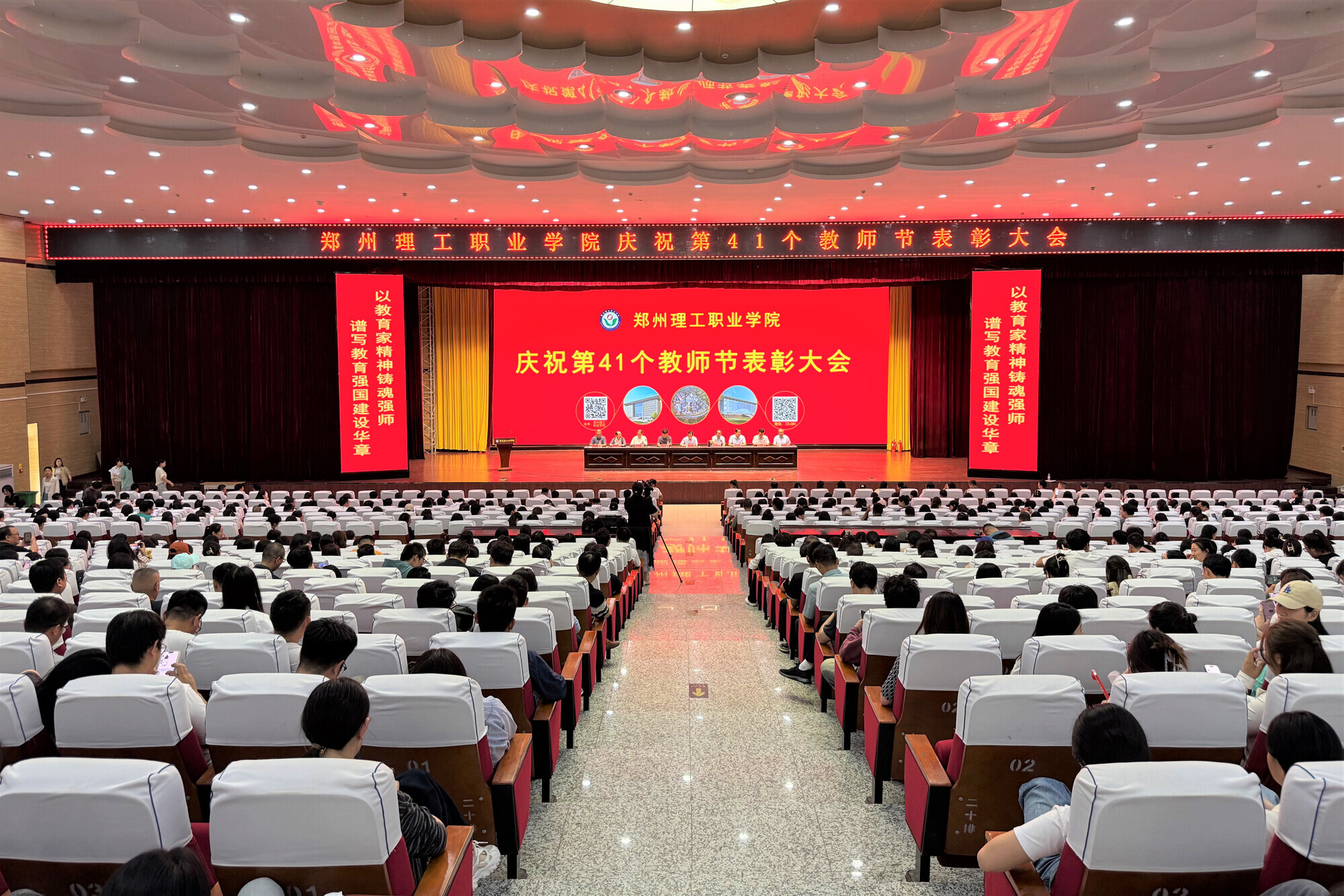 双手扶持千木茂,一心培育百花开。9月9日下午,郑州理工职业学院以“以教育家精神铸魂强师,谱写教育强国建设华章”为主题,隆重召开庆祝第41个教师节表彰大会,对学校在教育教学和管理服务工作中涌现出来的先进集体和先进个人进行表彰。校长张久铭、党委副书记王凌彬及其他校领导班子成员出席会议,全体教职工与学生代表参加大会。