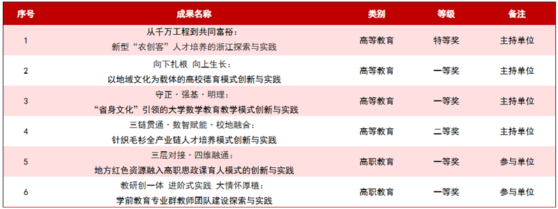 据了解,浙江省教学成果奖由浙江省政府设立,每4年评审1次,其获奖成果代表着全省教育教学改革理论创新与实践探索的重要突破,能够对提高教育教学水平、提升人才培养质量产生明显效果和示范作用,也是衡量学校人才培养质量的关键指标之一。
