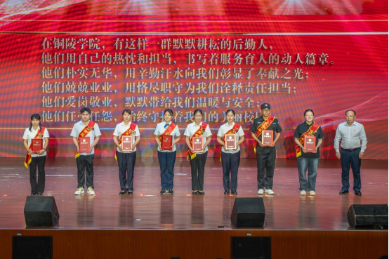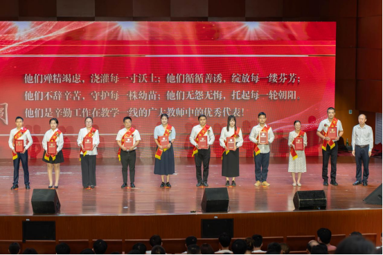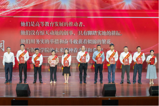 会上,铜陵学院党委副书记、校长苏本跃宣读了学校表扬决定。党委委员、副校长童健、夏美武,党委委员、纪委书记高文,党委委员、副校长疏仁华,党委委员、党委宣传部(统战部)部长查道懂分别为“优秀教育工作者”“优秀科技工作者”“优秀辅导员”“优秀教师”“优秀服务员工”等代表颁发《荣誉证书》,校党政领导班子全体成员为“躬耕教坛”代表颁发奖牌和证书。获表扬代表分享了获奖感言。