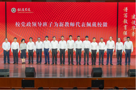在新进教师入职仪式上,铜陵学院党政领导班子全体成员为2025年新进教师佩戴校徽。新入职教师在合作交流处处长刘珺的带领下,庄严宣誓,承诺恪守师德、潜心育人。