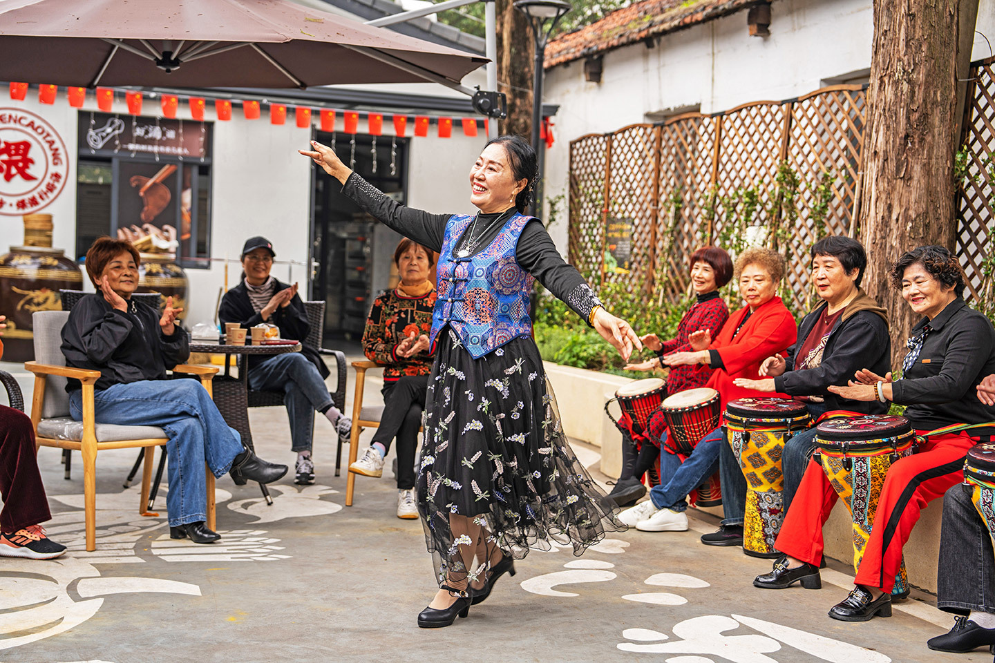 金华市八咏楼居家养老服务照料中心,居民们欢聚一堂、载歌载舞,气氛热烈。