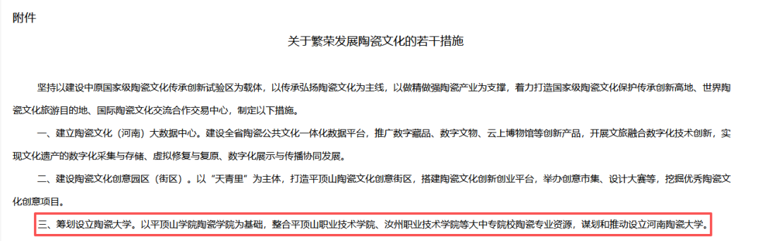 近日,河南省平顶山市人民政府办公室印发《关于进一步加快文旅产业高质量发展的意见》,其中提到:筹划设立陶瓷大学。以平顶山学院陶瓷学院为基础,整合平顶山职业技术学院、汝州职业技术学院等大中专院校陶瓷专业资源,谋划和推动设立河南陶瓷大学。