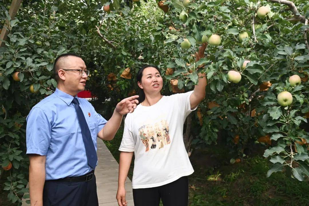 8月14日,新疆维吾尔自治区阿克苏市检察院检察官来到阿克苏红旗坡丰庆园果品农民专业合作社走访农户,开展阿克苏苹果地理标志保护工作 。