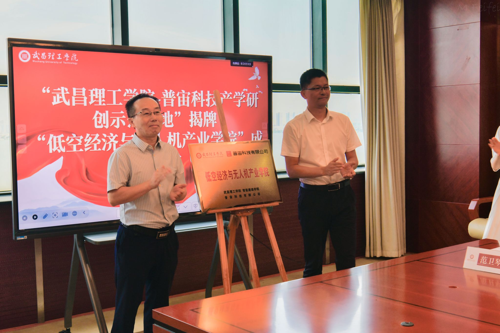 在与会嘉宾的共同见证下,武昌理工学院智能建造学院院长柳立生与普宙科技总经理陈虎一同为“低空经济与无人机产业学院”揭牌。