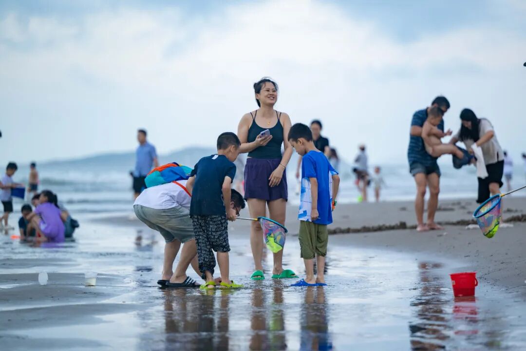 眼下,这场狂欢仍在继续,非遗文创市集里,老艺人的指尖流转着海洋主题的纹样;网红啤酒盲盒车旁,年轻人们举着酒杯碰出清脆的响,情侣们在落日余晖里依偎拍照,赶海的亲子家庭则提着沉甸甸的收获,把欢笑声撒在退潮的滩涂。
