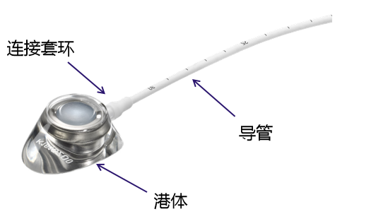 输液港由导管和注射座组成,导管末端位于上腔静脉,注射座埋在皮下。