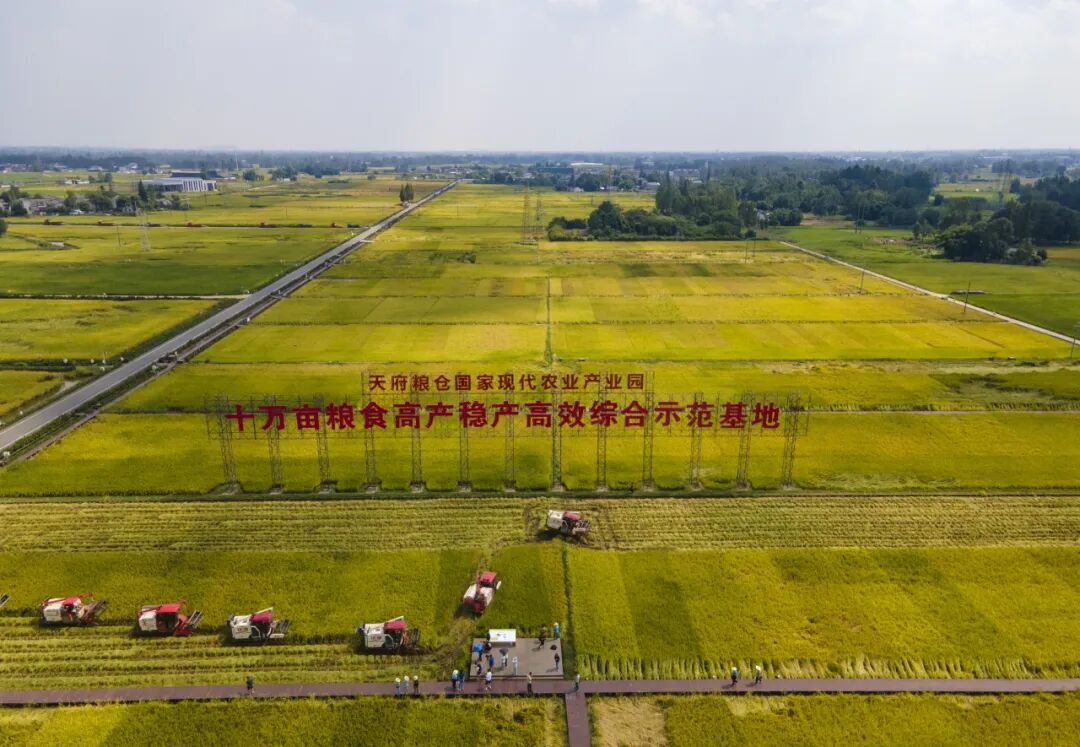 9月中旬,位于崇州市的天府粮仓国家现代农业产业园核心区,水稻已进入收割期。金黄的稻田里,稻浪飘香,机器轰鸣。