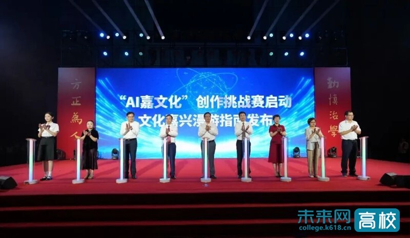 浙江省教育厅二级巡视员朱鸿飞,嘉兴大学党委书记沈希,嘉兴大学党委副书记、校长梅德庆,嘉兴市教育局党组书记、局长武曜云,市文化广电旅游局党委书记、局长顾建忠,市社科联专职副主席胡勤芳,市新闻传媒中心党委委员、副主任杨洁,嘉兴大学党委原副书记、嘉禾文化育人联盟专家委员会专家吴云达和新生代表曹乐共同启动“AI嘉文化”创作挑战赛、发布“文化嘉兴漫游指南”。