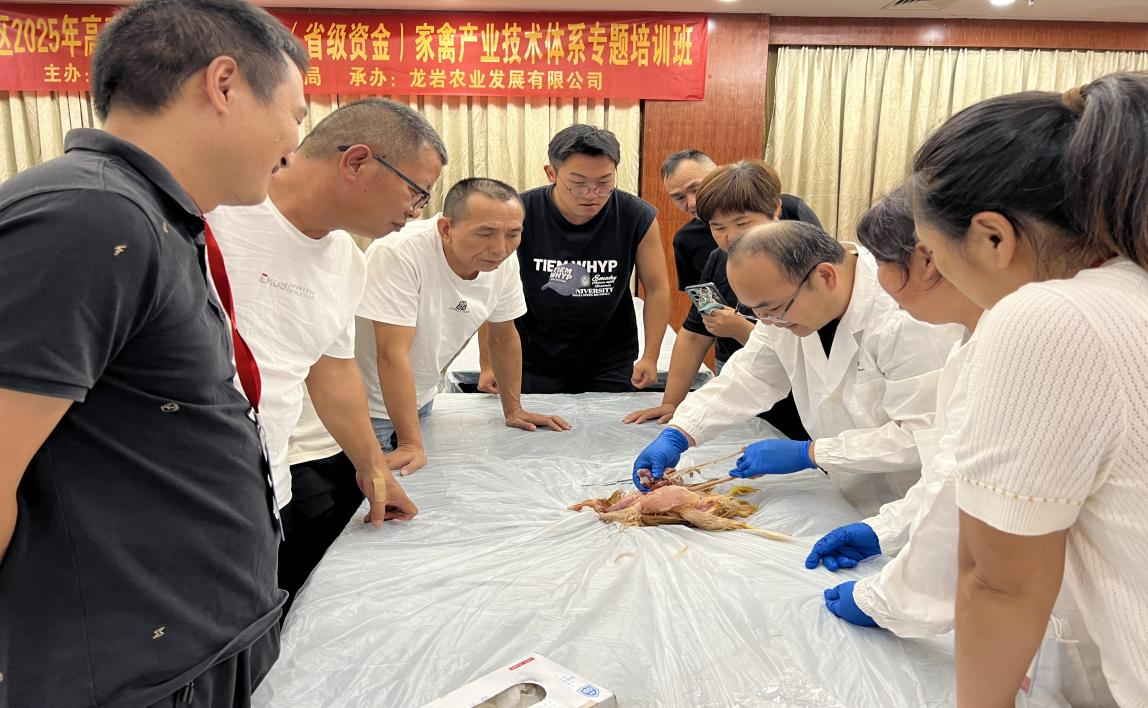 理论筑基: 龙岩市农业学校高级教师梁添勇深入解读中央一号文件精神;龙岩学院孙艳发副教授系统讲授肉鸡科学饲养管理技术;宋迟博士(龙岩市汇和农业科技有限公司负责人)详细讲解蛋鸭、肉鸽高效养殖关键技术及疫病防控要点;龙岩市农业学校高级教师郭升伟则重点传授禽病解剖流程与病理识别知识。