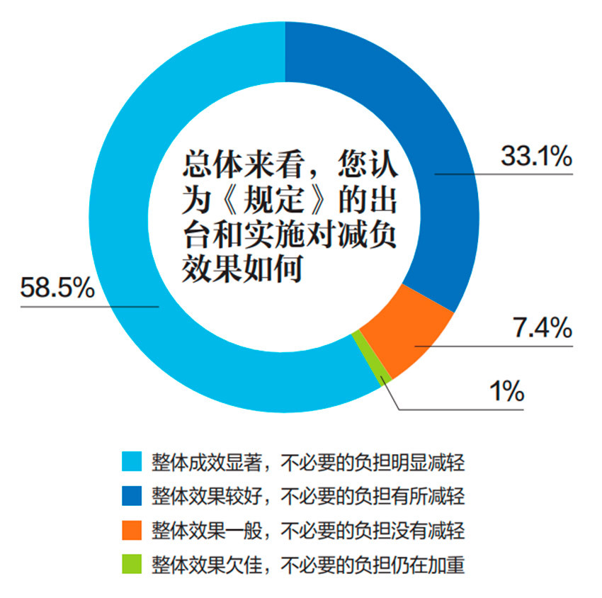 “两个责任”同向发力。以上率下,方能下行效仿。减负工作取得成效,关键在于压实了全面从严治党主体责任和监督责任。主体责任扛稳抓牢,一级做给一级看。调查显示,高达96%的受访干部肯定本单位领导班子落实《若干规定》的积极性。其中,75%的受访者感受到领导“高度重视,主动谋划,措施得力”。这充分表明,各级主要负责同志将减负工作紧紧抓在手上,从方案的制定到执行的督导,亲力亲为,形成了“头雁效应”。许多地区创新推出“无会日”“无会周”,实行会议审批报备和捆绑打包制度,从源头上为会议瘦身。一位华东地区的乡镇党委书记在反馈中写道:“现在开会更务实了,多会合一成了常态,省下的时间都能用在跑项目、进村居、解难题上。”监督责任精准有力,执纪问责震慑常在。各级纪检监察机关立足监督的再监督职责定位,将整治形式主义为基层减负纳入政治监督重点,通过专项督查、暗访抽查、线索起底、典型通报等方式,对加重基层负担的行为“瞪大眼睛、拉长耳朵”,发现一起、查处一起、曝光一起,得到了基层的广泛认可。91.6%的受访干部肯定了监督成效,其中 68.9%的受访者(427人)认为监督“精准有力,敢于动真碰硬,效果显著”,这种强有力的纪律保障,确保了中央政令畅通,有效防止政策执行跑偏减速、变形走样。