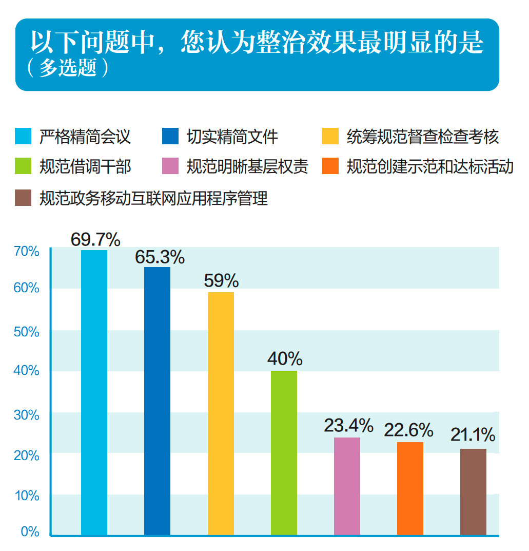 以往深受“迎来送往之苦”,现在腿脚没有那么累了,督查检查考核和调研活动更为规范。“现在下来督查调研,真解决问题的多了,走马观花、蜻蜓点水的少了。”一位西部乡镇干部这样评价。分别有62.4%和65.6%的受访者认为“督查检查考核”和“调研活动”规范成效“显著改善”。不少干部反馈,现在督查考核注重“合并同类项”,强调“四不两直”,重在解决问题而非制造问题。调研活动则力戒扎堆作秀、蜻蜓点水,更加注重解剖麻雀、解决难题。考核的“指挥棒”更加科学,工作的“风向标”更加清晰,推动基层工作从“重痕迹”向“重实绩”转变。