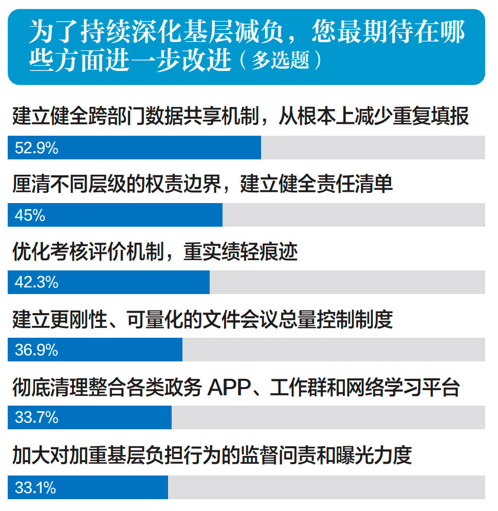 减负不减担当,松绑更添干劲。在《若干规定》深入实施的过程中,各地区各部门坚持减负和赋能同步发力,推动人往基层走、钱往基层投、政策向基层倾斜。广大基层干部轻装上阵、放手干事,将更多精力投入到解决实际问题、服务人民群众中去。成效面前,尤需冷静。必须清醒地认识到,形式主义、官僚主义具有顽固性、反复性,调查数据一定程度上揭示了减负工作面临的深层挑战与薄弱环节,一些老问题换上了“新马甲”,一些形式主义问题仍然屡禁不止,体制机制建设还存在短板不足,一些地方和部门产生松劲懈怠心理,基层减负各项规定落实还有差距。