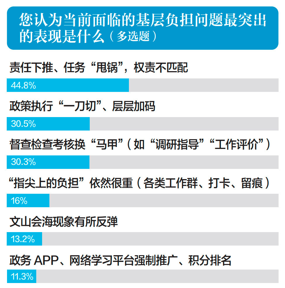反映集中的痛点是“权责不对等”导致“小马拉大车”。这是所有问题中反映最强烈的,也是基层负担的根源。55.5%的受访者认为“规范明晰基层权责”效果最不明显。44.8%的受访者将“责任下推、任务‘甩锅’,权责不匹配”列为当前最突出问题。比如,某乡镇收到上级多个部门下发的关于自建房安全隐患排查的紧急任务,乡镇既无专业鉴定资质,也无执法处罚权,却要承担排查认定上报、劝解整治的全部“属地责任”。干部们只能“用脚步丈量”,凭肉眼观察,填写大量表格,但面对拒不配合的房主,束手无策,一旦出事,却首当其冲被问责。这种权力在部门,责任在乡镇的错配,让基层干部流汗又流泪,反映出有的上级部门通过“属地管理”原则将自身法定职责一推了之,用“问责”代替“担当”,其背后是懒政思维和特权思想在作祟。