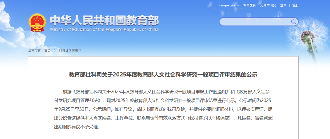 9月25日,教育部社科司公示了2025年度教育部人文社会科学研究一般项目评审结果。