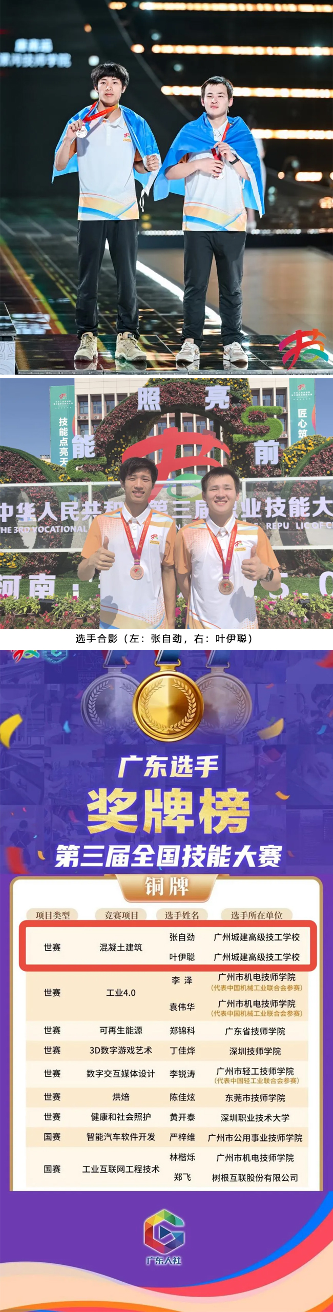 在本届大赛上,广州城建高级技工学校学子张自劲、叶伊聪代表广东省参加混凝土建筑项目角逐。面对来自全国的25支强劲队伍,他们沉着应战,凭借扎实的专业技能和出色的临场发挥,最终荣获铜牌,并成功入围第48届世界技能大赛国家集训队。