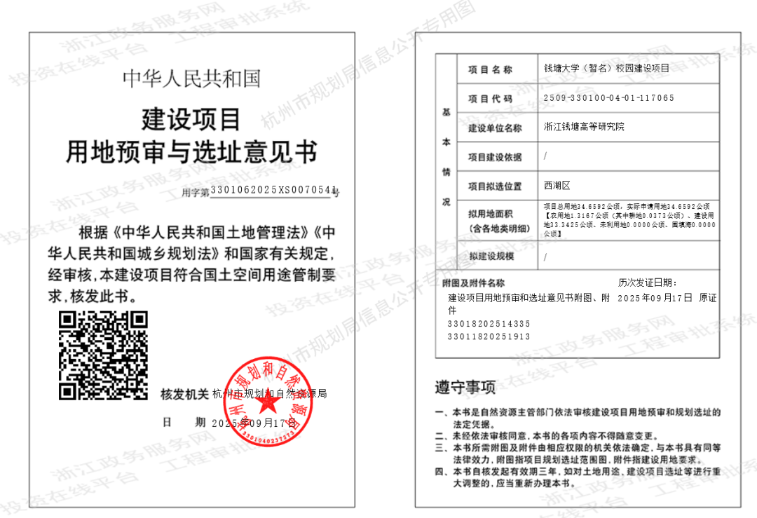 同年6月,杭州市行政审批服务管理办公室网站刊发一则由杭州市规划和自然资源局供稿的文章《钱塘大学获批!为高等教育发展注入强劲动力》显示,钱塘大学用地已于5月17日获得省政府批准,为钱塘大学落地建设筑牢了土地要素根基。