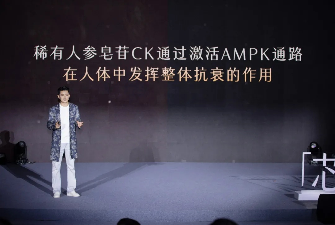 其二是“稀有人参皂苷CK”。人参皂苷CK在自然界仅在30年以上老山参中微量存在,其转化依赖体内菌群和酶。谷雨通过双专利的“智酶仿生科技”,模拟人体转化过程,利用AI从近200万种酶中筛选出6种最优生物酶,实现体外高纯度(大于98%)人参皂苷CK生产。高通量蛋白组学实验显示,其可显著结合22个皮肤抗老靶点,同时促进Ⅳ型胶原生成高达397%,促生胶原能力远超玻色因和A醇。更为重磅的是,厦门大学林圣彩院士团队初步实验结果表明,稀有人参皂苷CK可激活AMPK通路,而AMPK与健康长寿密切相关。这意味着谷雨的稀有人参皂苷CK不仅实现了高纯度及量产,更重要的是引领研究进入“整体抗衰新时代”——开启该原料在精准护肤和大健康领域的深度应用,后续还将在其他科研领域中探索应用。