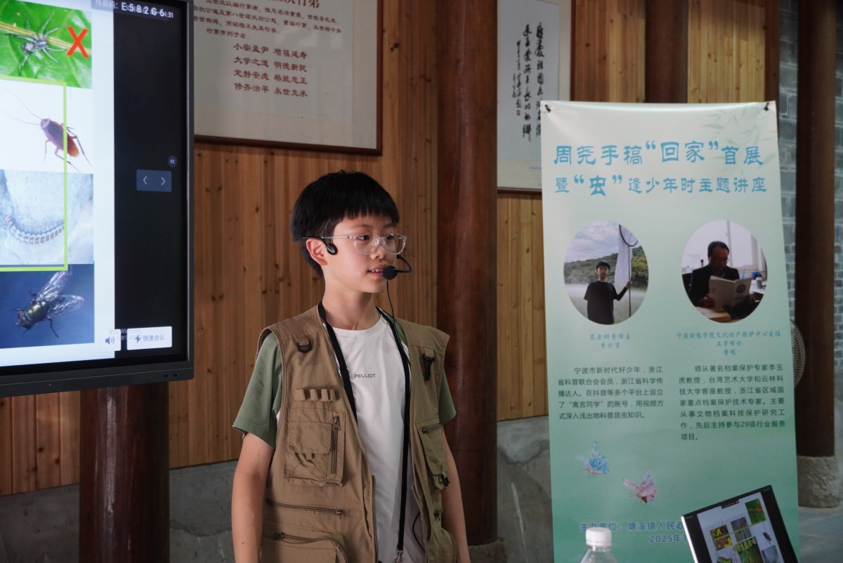 青砖黛瓦沐秋阳,百年故居盼“君”归。10月6日下午,在宁波市鄞州区塘溪镇,中国昆虫学泰斗、有“蝶神”之称的周尧,那些他记录万千虫趣的珍贵手稿,终于回到了他出生成长的故居,迎来“归乡首展”。20余组家长带着孩子专程奔赴,在泛黄纸页间,与这位科学家开启一场跨越时空的“科学之约”。