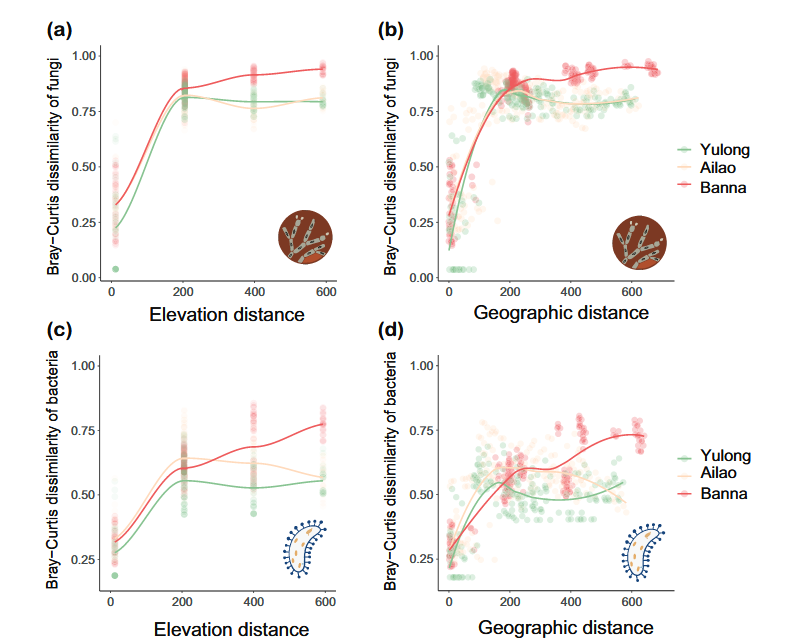 不同研究地点中微生物的距离衰减关系和海拔分布范围大小。(a–b)真菌和(c–d)细菌的 β 多样性(Bray–Curtis 差异度)的距离衰减关系