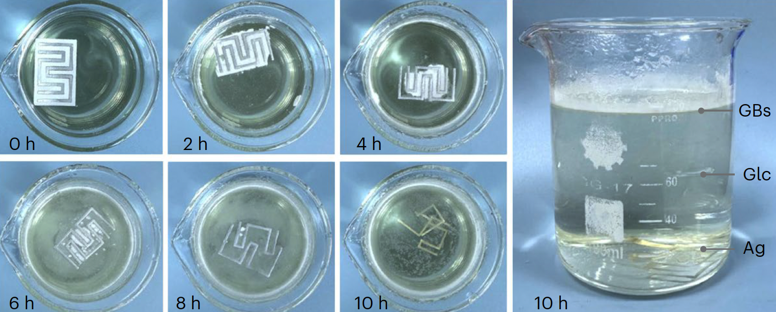 在酶的作用下,纤维素逐渐分解,玻璃微珠因为密度差异会自然浮起,可以用注射器轻松分离。通过离心过程,回收的银和葡萄糖溶液得以分离。
