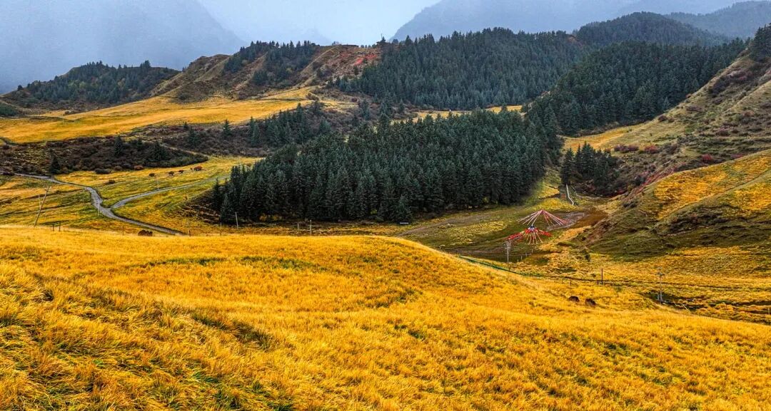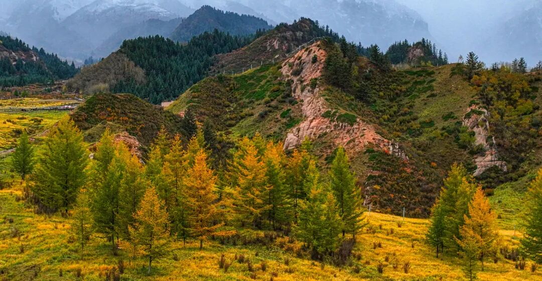 金秋十月,西北的祁连山国家公园迎来了一年中最绚烂的季节。祁连山国家公园张掖市肃南裕固族自治县马蹄乡段,原始森林、雪山、草甸、红叶、白霜等元素形成垂直景观带,秋色与冬景交织,呈现出雪白、金黄、深红、湛蓝等色调对比,黄绿交织,红金点染,仿佛大自然执笔挥洒的油画,静谧而热烈,一幅优美的天然画卷展现在人们面前。(张掖市融媒体中心记者 王将)