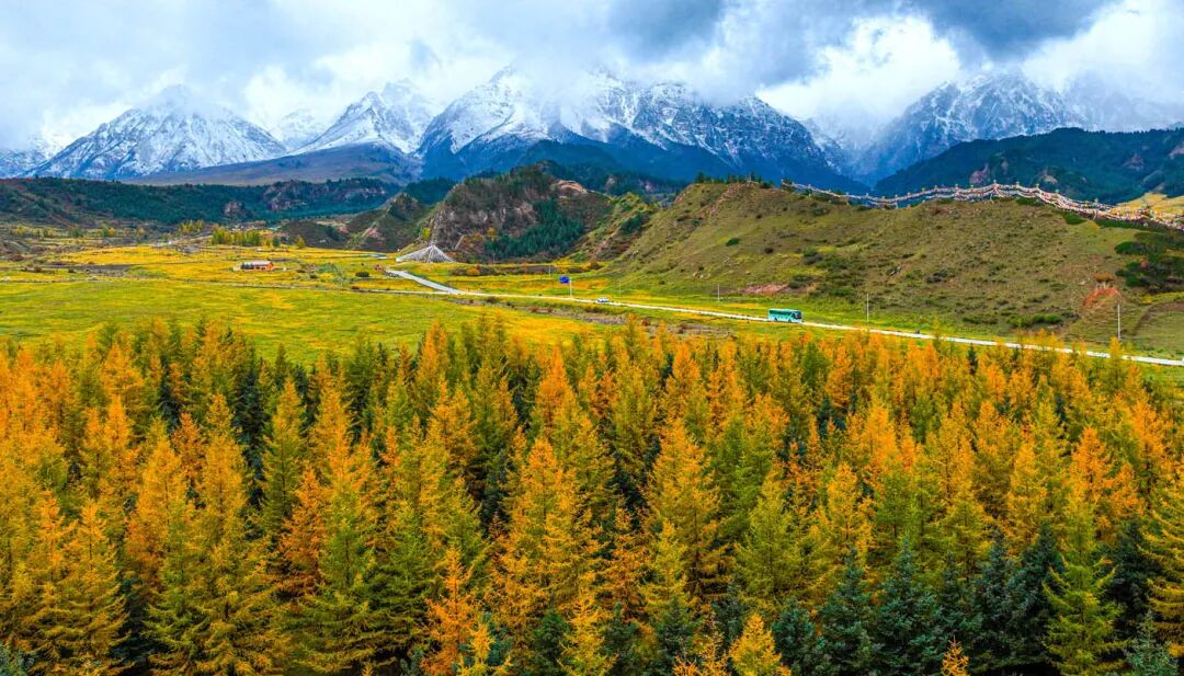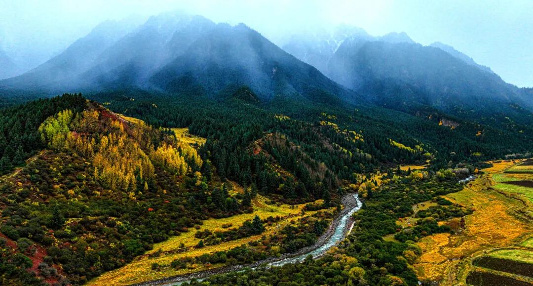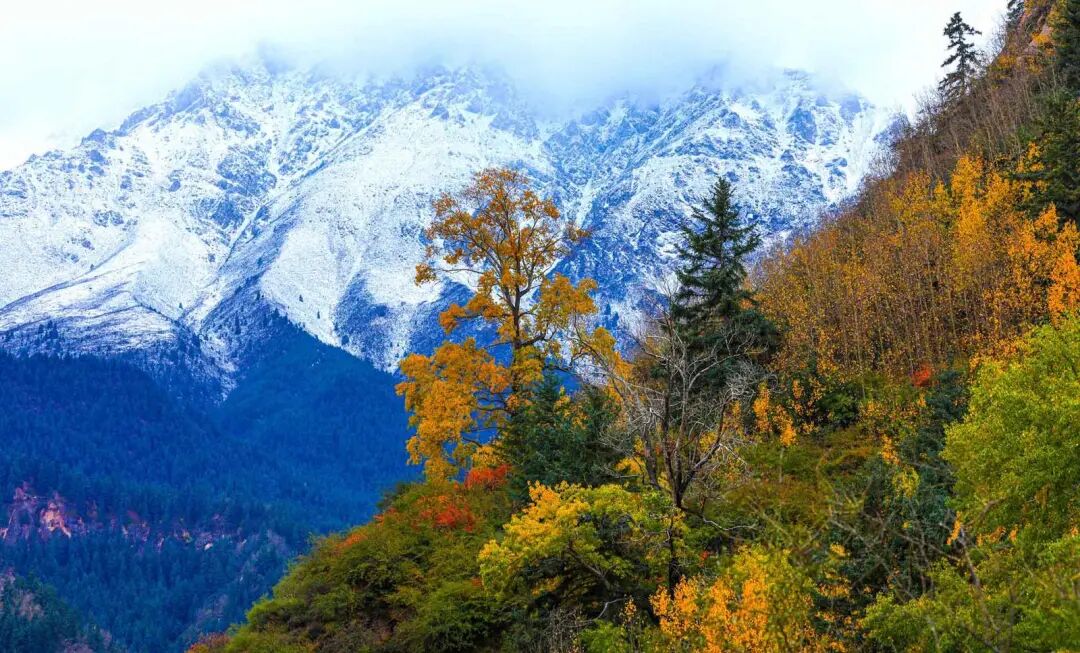 10月11日,一场小雪过后,祁连山国家公园张掖市肃南裕固族自治县马蹄乡段山顶白雪皑皑,山间云雾缭绕,树木层林尽染,形成色彩斑斓的深秋美景。