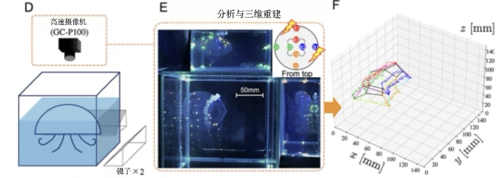 F通过整合来自三个视角的数据,研究人员成功地在电脑中重建了水母身体在三维空间中的精确模型和运动轨迹 。