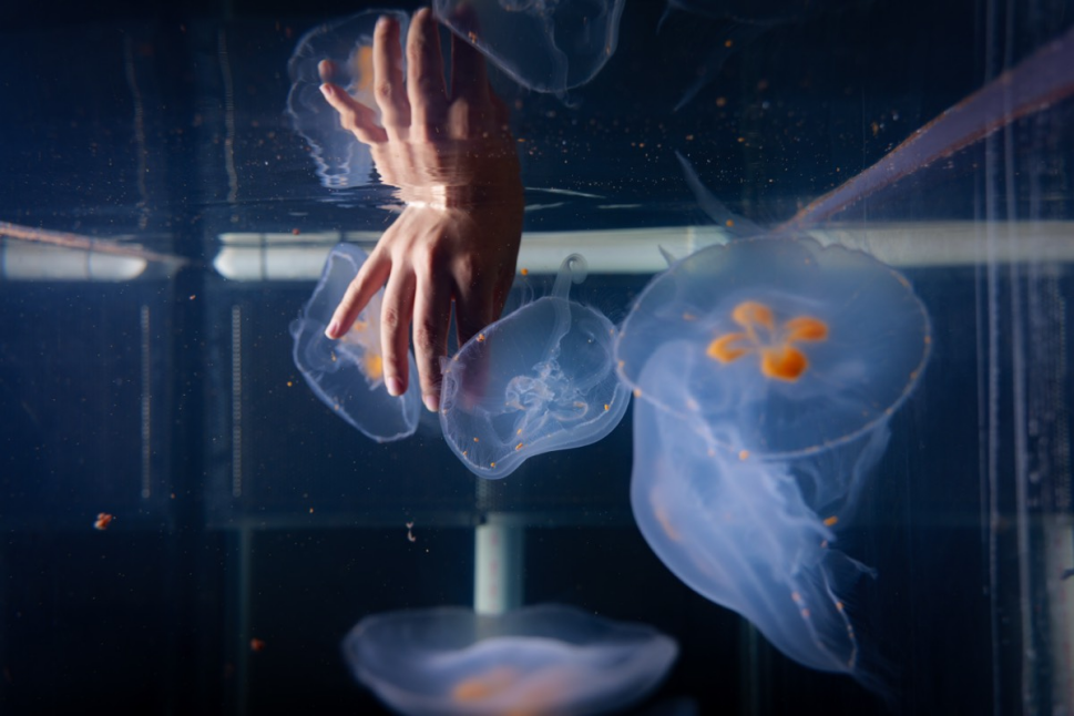 一只手正在轻轻触碰一群在水中漂浮的水母
