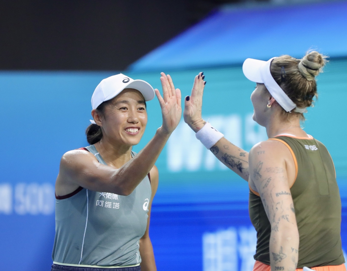 张帅(左)与队友万卓索娃(右)在比赛中击掌。徐诚 摄