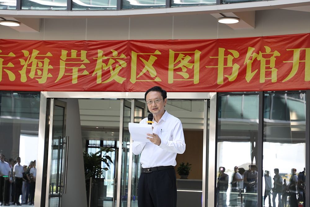 执行校长、汕头大学图书馆工作委员会主任委员王泉院士作开馆致辞。在致辞中,王泉代表学校,向为东海岸图书馆倾注心血的校内各部门同仁表示感谢,向图书馆全体馆员表示祝贺。他指出,总建筑面积3.5万平方米的东海岸校区图书馆,将成为东海岸校区的地标,更将成为汕头大学校园文化的象征。东海岸校区图书馆“智慧之环”的造型与桑浦山校区图书馆“东方书盒”的造型遥相呼应,共同构成了汕头大学继往开来的山海文化叙事。王泉在致辞中介绍,东海岸校区图书馆主楼藏书总容量约120万册,设有2800余个阅览座位。